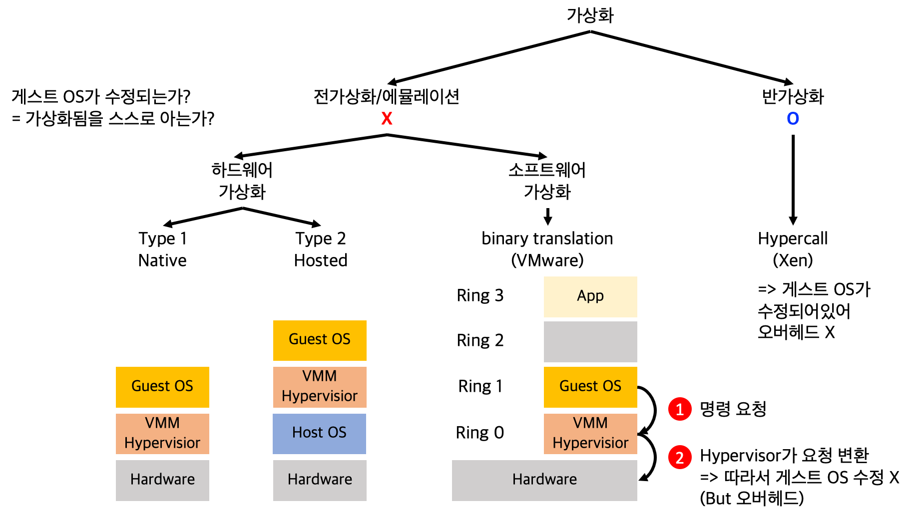 - 전가상화 : G.OS를 수정하지 않음. 따라서 OS가 달라 명령어 전달이 안될 수 있음. 그 중간에서 G.OS의 커널이 개입해야하는 요청을 처리하는 특권 주체가 H/W 또는 Hypervisior.