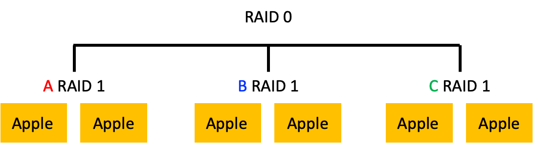 2) RAID 1 : 최소 2개 필요. apple + apple. 미러링 방식으로 똑같이 복제.