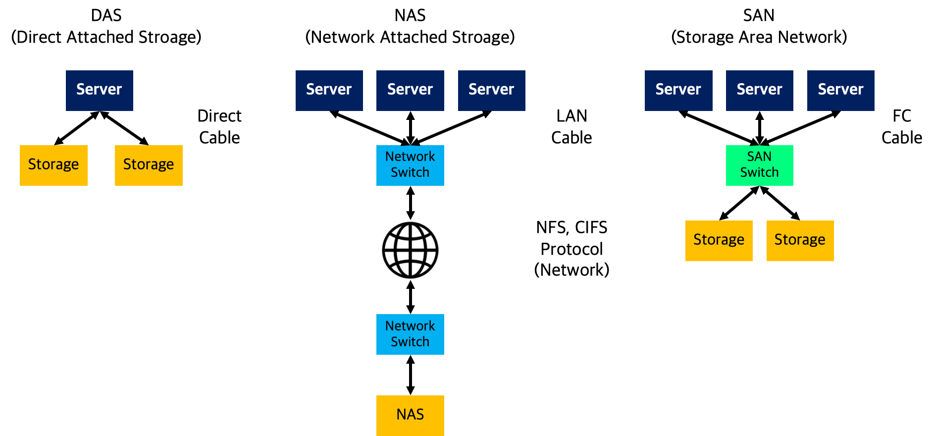 1) DAS : 다이렉트로 직접 연결. 블록 단위 입출력. 일반적인 외장하드, 추가 디스크 등.